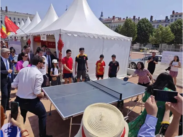 陸青江總領事陪同里昂市長杜塞、副市長茲多羅夫佐夫等來賓參觀中國展棚,法國小熊貓學校鄧翔教練帶領小熊貓乒乓球隊的三位省級冠軍球員陳玉麒、陳玉麟和柯弘毅組成“小熊貓乒乓天團”,現(xiàn)場做了精彩表演,并和市長及總領事進行乒乓球?qū)Υ蚓毩暋?strong>隨后,杜塞市長還興致勃勃的同陸總領事打起乒乓,并表示充分感受到中華文化的博大精深和中華體育之美。