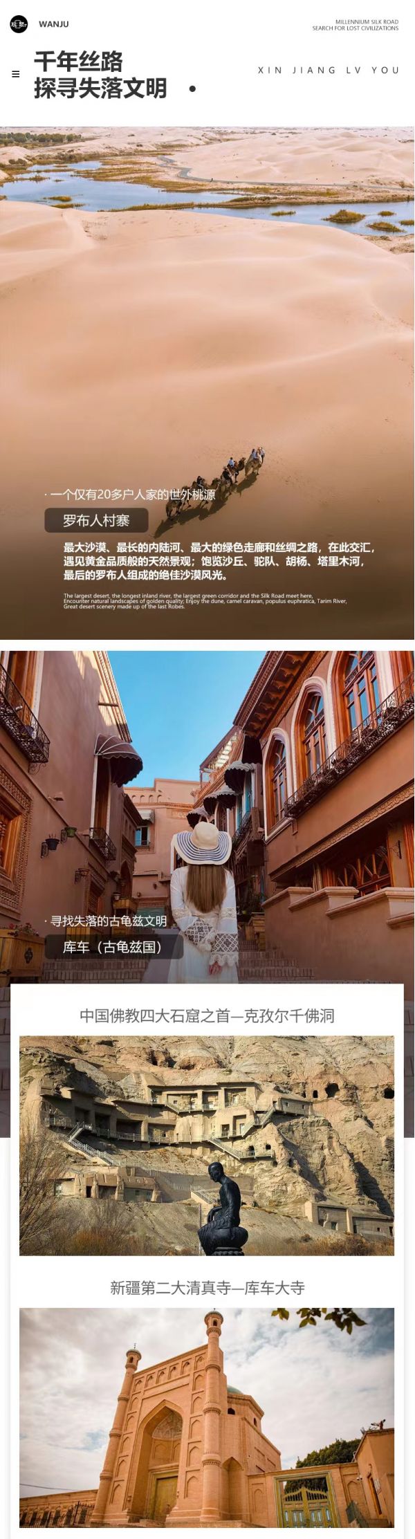 今早我們從烏魯木出發(fā),前往“香梨的故鄉(xiāng)”【庫(kù)爾勒市】。沿途車覽有著“中國(guó)死海”美譽(yù)的-十里鹽湖、亞洲最大的風(fēng)力發(fā)電站--達(dá)坂城風(fēng)力發(fā)電站。在位于塔克拉瑪干沙漠邊緣的羅布泊,我們將遇見(jiàn)一個(gè)隱藏的世外桃源——【羅布人村寨】。毗鄰中國(guó)最大的沙漠塔克拉瑪干沙漠,最長(zhǎng)的內(nèi)陸河塔里木河流經(jīng)此地,最大的原始胡楊林保護(hù)區(qū)在這里阻隔風(fēng)沙,絲綢之路在這里向西延伸,這個(gè)古老神秘的村寨坐擁頂級(jí)天然景觀。人文景觀同樣引人入勝,這里住著“不種五谷,不牧牲畜,唯以小舟捕魚為食”的最后的羅布人,羅布人是新疆最古老的民族之一;走進(jìn)村寨,好像進(jìn)入一座偌大的拍攝古裝歷史影片的影城。沙丘、駝隊(duì)、胡楊、塔里木河、羅布人....在此匯聚,絕美沙漠風(fēng)光在此定格。