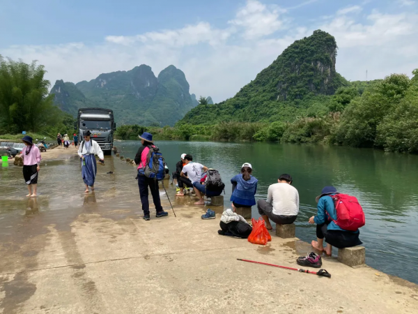 游覽陽朔風(fēng)景如畫的線路【十里畫廊】車觀(游覽時(shí)間約20分鐘),陽朔十里畫廊位于陽朔月亮山,因沿路風(fēng)景秀麗,如詩如畫,被稱為陽朔十里畫廊。主要景觀有佩桃獻(xiàn)壽、海豚出水、尼姑下山、火焰山、八戒曬肚、金貓出洞、馬象奇石、龍角山、猴子民愁、駱駝過江、青厄風(fēng)光、古榕美景、美女梳妝等。人在路上走,如在畫中游,說不完的妙處。清風(fēng)迎面吹來,望著兩旁的青山綠樹,行走在鄉(xiāng)村阡陌,品花香、稻香、泥香,一路拍拍走走,沿途的奇山秀水,近距離感受著桂林山水之美、獨(dú)特的喀斯特地貌和那清澈的漓江水。沿途,我們還會(huì)欣賞到著名陽朔美景【駱駝過江】,十里畫廊東側(cè),工農(nóng)橋旁望去,在一望無際的田園間,田家河像條白絹,宛然曲折東流,河邊有一山,酷如駱駝,形態(tài)似自得漫步,前往欲過河,人稱“駱駝過江”。
