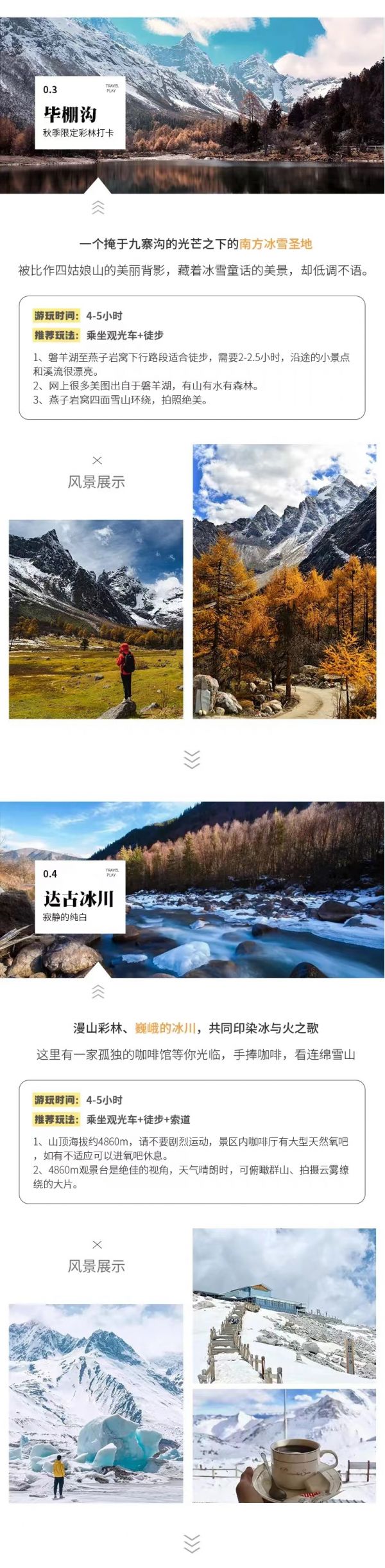 隨后游覽【紅軍湖】、【紅軍橋】、【神牛湖】,欣賞沿途的美景。后到達索道下站,也就是觀光車終點站,從這里開始就是達古冰川的精華景點,10-11月紅葉彩林漫山遍野,層林盡染,猶如一幅彩色油畫。我們可以在索道下站坐索道直接上到山頂?shù)谋ǜ沟兀催B綿雪山冰川,觀賞【一號冰川】,感受一覽眾山小,俯視一切的雄壯氣概。還可以在世界上海拔最高的咖啡館,同時也被稱為【世界上最孤獨的咖啡館】,喝上一杯咖啡,飽覽美景。看過冰山下的秋景前往黑水縣入住。