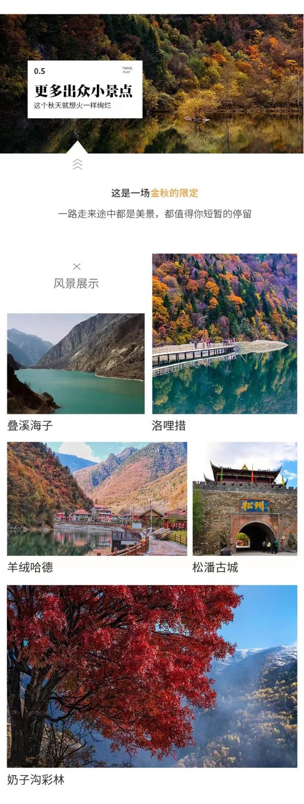住宿:黑水酒店標間說明”早餐后經(jīng)米亞羅、鷓鴣山隧道,隨后來到奶子溝,秋天的【奶子溝】是彩林的世界,在雄奇的冰川下、美麗的雪山上、獨特的藏寨邊、蜿蜒河流旁均有成片的彩林分布,是亞洲最大的天然彩林,享有“八十里畫廊”的美譽。游覽拍攝之后車繼續(xù)前行,沿途會經(jīng)過一個叫【洛哩措】的地方,這里像是一塊地球送給我們的綠寶石,陽光和煦、波光粼粼,連掠過的風,都是自由的。隨后來到【羊茸哈德藏寨】,當?shù)厝私小岸透隆保馑际恰?strong>神仙居住的地方”,清一水的藏式民居坐落于彩林間,彩色的窗沿點綴著整個建筑,色彩素雅又歡快。藏寨碧水潺潺、林蔭繁茂、彩林環(huán)繞、色調(diào)分明、鱗次櫛比,這里的藏人服飾獨特,淳樸善良,隨處可見神秘的宗教符號,五彩的藏家建筑與七彩經(jīng)幡交相輝映,有著濃郁的嘉絨藏族風情。