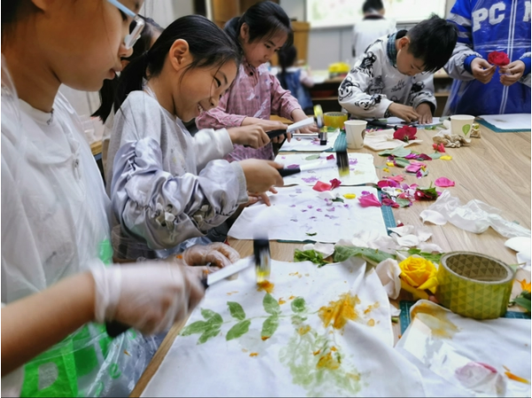 扎染和拓染是我國(guó)民間特有的印染技術(shù),是非物質(zhì)文化遺產(chǎn),其工藝從扎到染、從拓到染都具有豐富的創(chuàng)造性。首先,老師以故事的形式講解了扎染的由來(lái)及制作過(guò)程,同學(xué)們都躍躍欲試。但是在扎繩子的時(shí)候同學(xué)們卻犯了難,不知道怎么樣扎出自己想要的圖案。通過(guò)老師講解、示范,同學(xué)們有了思路,經(jīng)過(guò)自己的探索,扎出了各種形狀,涂染上不同的顏料;拓染活動(dòng)又引爆了同學(xué)們的興奮點(diǎn),同學(xué)們揮動(dòng)著錘頭,敲打著早已經(jīng)準(zhǔn)備好的花草,期待著完成后的驚喜。