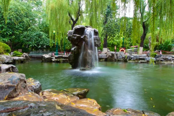 濟南市五龍?zhí)豆珗@東南隅,看到月牙泉泉水由泉池中央蘑菇云狀的疊石三面齊涌而出,似飛瀑、若水簾,甚為壯觀。