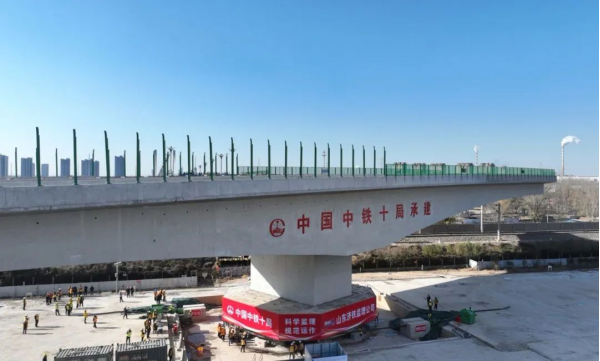 聊城西關街高架橋東起昌潤路、西至海源路,全長1932米,上跨京九鐵路、南水北調(diào)河,是山東省重大民生項目,是聊城市區(qū)通往高鐵新區(qū)及高鐵站的主干道。此次跨京九鐵路轉(zhuǎn)體梁為目前聊城市噸位最大、跨度最長、轉(zhuǎn)體角度最大、梁面最寬的轉(zhuǎn)體橋工程,這一重要節(jié)點的打通標志著聊城西關街高架橋工程又一關鍵控制性工程取得重要進展,為接下全線通車奠定了堅實基礎。