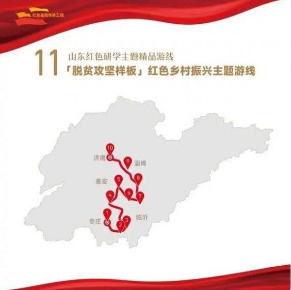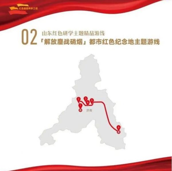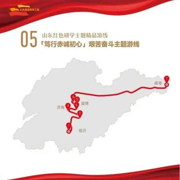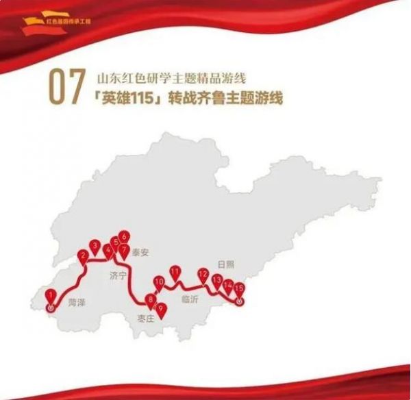 1. 菏澤市湖西人民會議廳舊址——2.濟(jì)寧市翟莊黨支部舊址——3.棗莊市滕州微山湖紅荷濕地景區(qū)——4.棗莊市津浦鐵路臨城站舊址——5.濟(jì)寧市微山湖旅游區(qū)——6.濟(jì)寧市微山縣劉少奇過湖處遺址——7.煙臺市招遠(yuǎn)羅山黃金生態(tài)旅游區(qū)