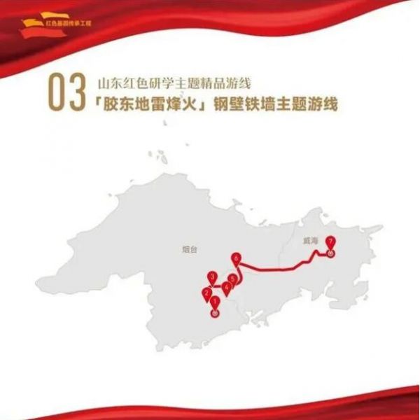 1. 煙臺市地雷戰(zhàn)旅游景區(qū)——2.煙臺市海陽地雷戰(zhàn)紀(jì)念館——3.煙臺市八路軍膠東軍區(qū)機(jī)關(guān)舊址——4.威海市馬石山烈士陵園——5.威海市紅色密營(下石硼村)——6.威海市膠東育兒所——7.威海市文登天福山革命遺址