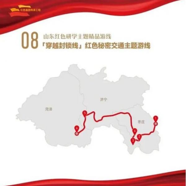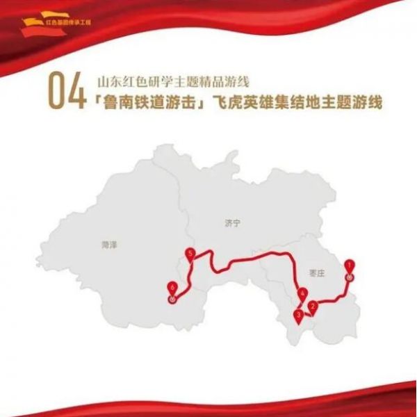 1. 棗莊市八路軍抱犢崮115師紀(jì)念園——2.棗莊市白樓灣運(yùn)河支隊(duì)記憶館——3.濟(jì)寧市微山湖旅游區(qū)——4.棗莊市鐵道游擊隊(duì)景區(qū)——5.濟(jì)寧市魯西南戰(zhàn)役紀(jì)念館——6.菏澤市湖西革命烈士陵園