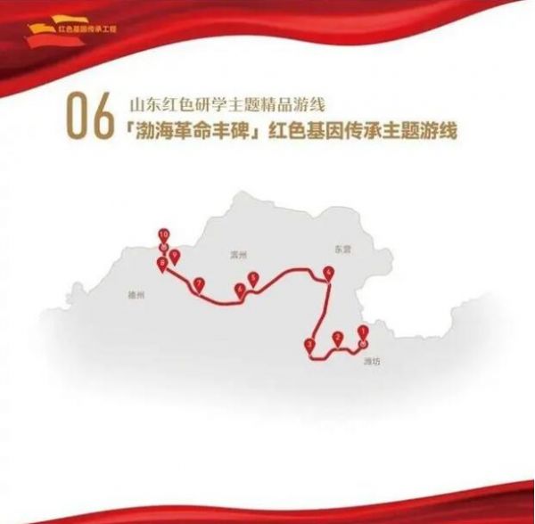 1. 濰坊市大家洼紅色革命研學(xué)基地——2.濰坊市壽光牛頭鎮(zhèn)抗日武裝起義陳列館——3.東營市紅色劉集旅游景區(qū)——4.東營市渤海墾區(qū)革命紀(jì)念館——5.濱州市渤海革命老區(qū)紀(jì)念園——6.濱州市渤海革命老區(qū)機(jī)關(guān)舊址——7.濱州市渤海革命老區(qū)兵器博物館——8.德州市冀魯邊區(qū)革命紀(jì)念園——9.德州市八路軍冀魯邊區(qū)抗戰(zhàn)郵局舊址——10.德州市北海銀行冀魯邊區(qū)分行舊址