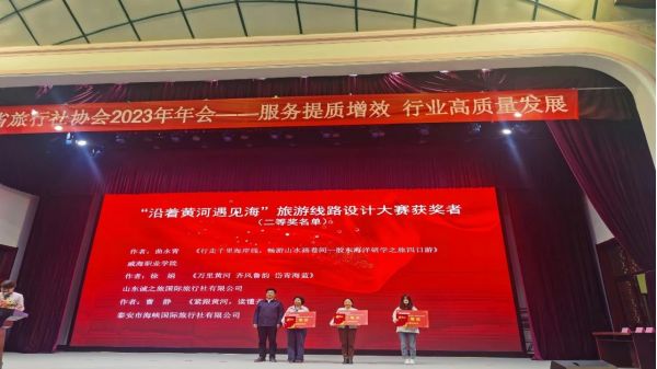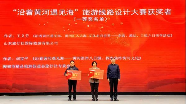 會上,對山東省“沿著黃河遇見海”旅游線路產品設計大賽獲獎者予以證書和現(xiàn)金獎勵。