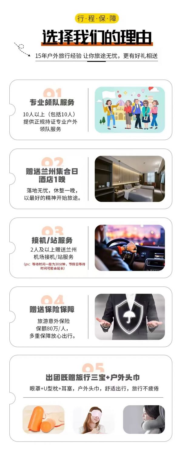 接機(jī)/站服務(wù):2人及以上免費(fèi)提供蘭州市區(qū)拼車接火車服務(wù),接火車的工作人員會(huì)在您出發(fā)日期前一天21:30之前向您推送消息并與您聯(lián)系,如果超過時(shí)間沒有接到任何通知,請(qǐng)及時(shí)與領(lǐng)隊(duì)或報(bào)名處聯(lián)系。(節(jié)假日用車人數(shù)較多情況下客人等待時(shí)間可能會(huì)延長;我方會(huì)安排臨近航班拼車接站,如遇其他客人航班火車延誤晚點(diǎn)情況,等待時(shí)間可能會(huì)延長,敬請(qǐng)諒解)