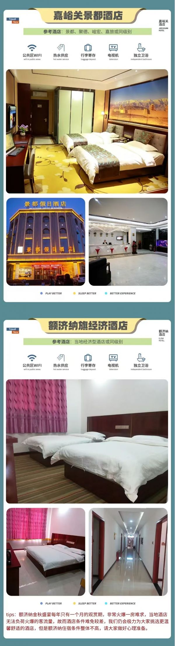 溫馨提示:西北晝夜溫差較大等地域問題,大部分酒店都沒有空調(diào),請(qǐng)?zhí)崆坝行睦頊?zhǔn)備。