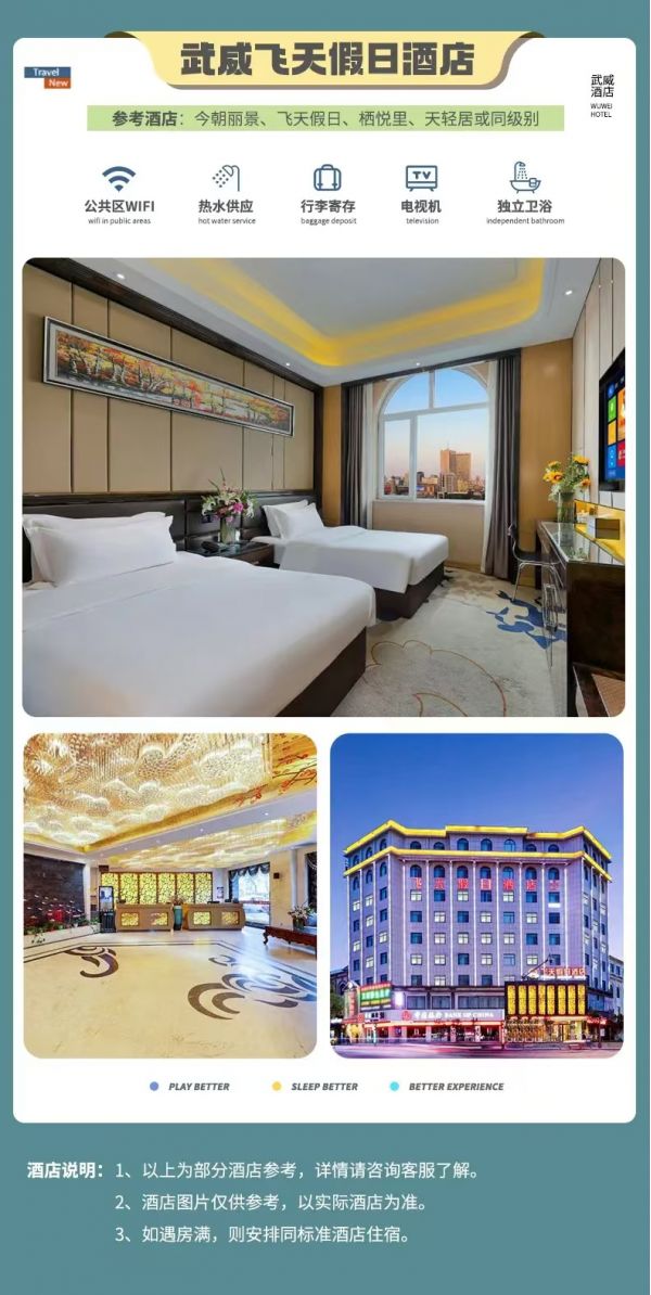 tips:蘭州集合酒店為贈(zèng)送酒店,酒店以實(shí)際安排為準(zhǔn)均不退不換不指定,如要更改酒店產(chǎn)生的費(fèi)用需要自行承擔(dān)。