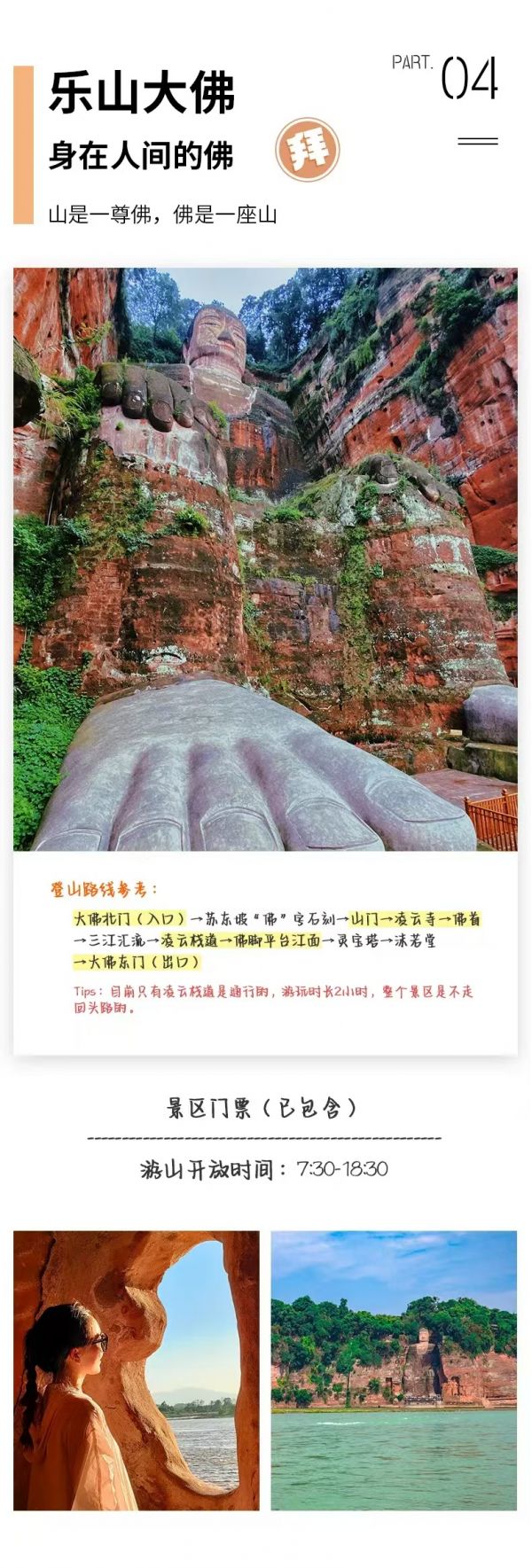 用午餐,品嘗世界非物質文化遺產-翹腳牛肉或峨眉地道九大碗(根據(jù)實際情況2選1安排),步行約15分鐘至迎春橋,乘坐旅游車來到樂山。深度登山游覽樂山大佛景區(qū)(參觀約3小時)步行333個臺階到達山頂,觀賞世界第一大彌勒坐佛-樂山大佛、凌云寺、九曲摘道、大雄寶殿、靈寶塔,在瞻仰樂山大佛宏偉氣勢的同時,體驗”蜀道難、難于上青天的感覺”,抱千年佛腳后,游漫山的石刻佛像、凌云寺、靈寶塔從東門下山返回到停車場。