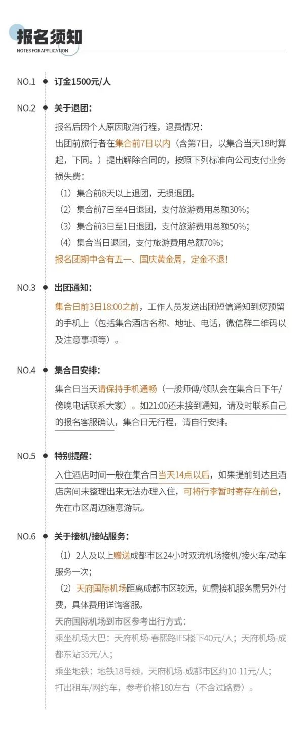 3、當天返回成都時間約在下午的21:30左右,由于不能預估有可能堵車等不可抗力因素情況,建議客人不要預定當天返程的火車或是飛機,以免因為堵車給您帶來沒有必要的損失。若因自行預定當天大交通造成延誤的,我社不賠償任何費用,不承擔任何責任!敬請知曉。