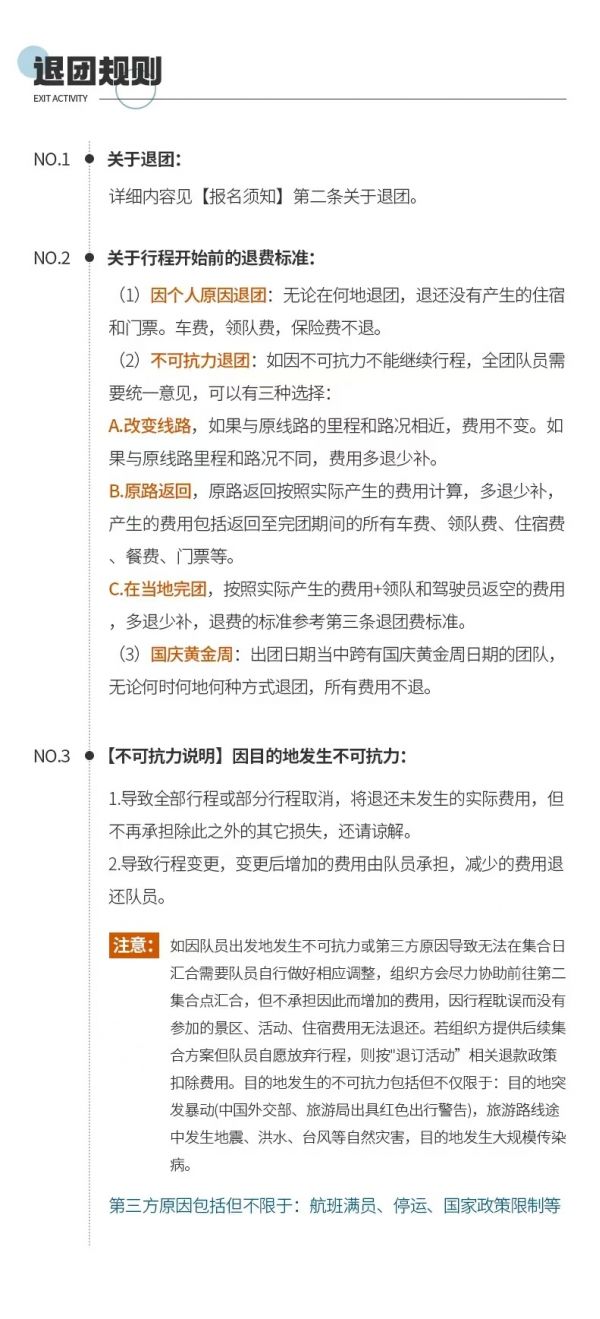 不可抗力:因不可抗力因素造成團隊行程更改、延誤、滯留或提前結束時,旅行社可根據(jù)當時的情況全權處理,如生費用增減,按未發(fā)生費用退還游客,超支費用由游客承擔的辦法處理。
