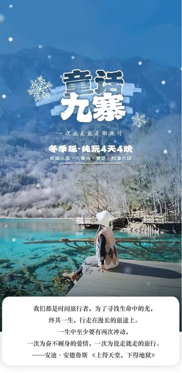 隨著季節(jié)的變化,九寨溝也呈現(xiàn)出不一樣的風(fēng)姿;深秋的九寨溝享譽(yù)世界,只見(jiàn)漸次經(jīng)霜的彩林深淺相間、錯(cuò)落有致,是“萬(wàn)山紅遍,層林盡染”的最佳寫照,在漫山遍野濃烈的紅襯托之下,碧水更綠、藍(lán)天更藍(lán),呈現(xiàn)出光怪陸離的水景;待入冬,莽莽林海都覆上皚皚白雪,林海雪原似玉樹(shù)瓊花,潔白、高雅,是觀賞九寨六絕之“藍(lán)冰”和“雪峰”的最好時(shí)機(jī)。也因這不二的美,這里也是許多熱門影視劇里的取景場(chǎng)地,今天我們就在這個(gè)大小熒屏收錄過(guò)的仙境來(lái)一場(chǎng)旅拍,由專業(yè)駐地?cái)z影師為大家拍攝漢服/藏裝旅拍大片,每人2張精修電子照、底片全送,定格住旅程最美的瞬間。