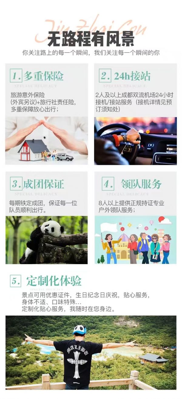 (2)九寨溝面積較大游客需求不一,因此主要以游客自助游形式游覽,如無(wú)領(lǐng)隊(duì)陪同望您諒解。游覽開(kāi)始前領(lǐng)隊(duì)會(huì)與您約定好集合時(shí)間,請(qǐng)務(wù)必按時(shí)到達(dá)指定地點(diǎn),避免耽誤大家接下來(lái)的行程;