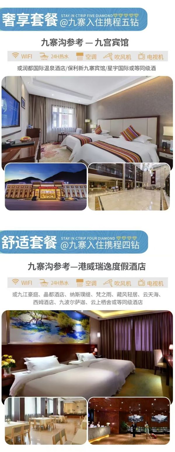 九寨溝:九江豪庭/港威瑞逸/晶都酒店/納斯璞緹/梵之雨/藏風(fēng)輕居/云天海/西姆酒店/九波爾薩迦/云上棲舍或等同級(jí)酒店