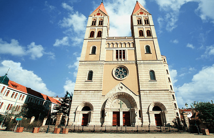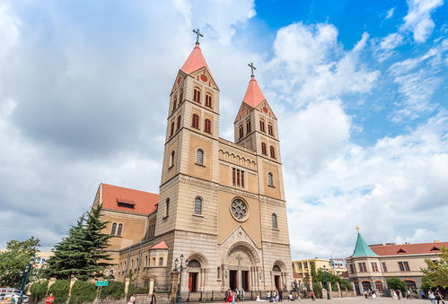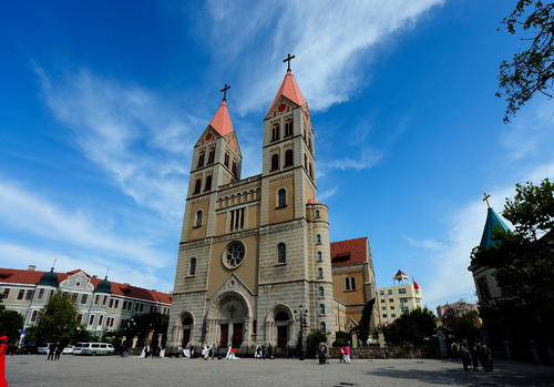 早7:00集合出發(fā),預(yù)計(jì)12:00到達(dá)青島天主教堂。后自由游覽,預(yù)計(jì)時(shí)間1小時(shí)。教堂以黃色花青島天主教堂崗巖和鋼筋混凝土砌成,表面雕以簡(jiǎn)潔優(yōu)美的紋案。窗戶為半圓拱形,線條流暢,顯得莊重而樸素。大門(mén)上方設(shè)一巨大玫瑰窗,兩側(cè)各聳立一座鐘塔,塔身高56米,紅瓦覆蓋的錐形塔尖上各豎立一個(gè)4.5米高的巨大十字架,塔內(nèi)懸有四口大鐘,一旦鐘樂(lè)鳴奏,聲傳數(shù)里之外。