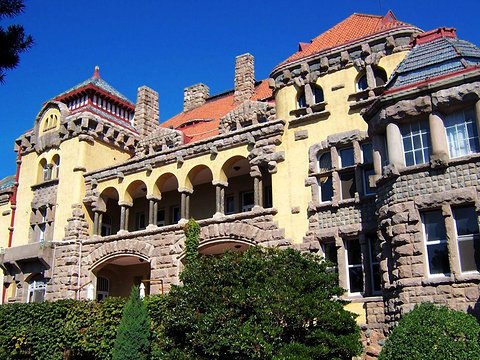 青島迎賓館(青島德國(guó)總督官邸舊址博物館)位于繁華商業(yè)區(qū)、風(fēng)景區(qū)的中部。背山面海,雄偉壯觀,它是一座歐式風(fēng)格建筑精華的薈萃,始建于1905年,建成于1907年,是當(dāng)時(shí)膠澳總督的官邸。建筑位于信號(hào)山半山腰上,地理位置優(yōu)越,環(huán)境幽雅。建筑設(shè)計(jì)師為德國(guó)人拉查魯維茨,建筑總監(jiān)為施特拉塞爾,工程耗資為四十五萬(wàn)金馬克。建筑面積四千余平方米,主體高三十余米。部分外墻飾以花崗巖作裝飾,石料加工粗樸。米紅色筒瓦、藍(lán)色魚(yú)鱗瓦、綠色牛舌瓦鋪設(shè)樓頂,使大樓更加精美別致。建筑主體為四層,共有大小房間30個(gè),其中主要展廳14個(gè)。各個(gè)展廳互相貫通,卻又各成一體,更令人稱(chēng)奇的是,每個(gè)展廳又三個(gè)不同之處,其內(nèi)部裝飾之豪華、造型之典雅,居我國(guó)單體建筑之首列 。