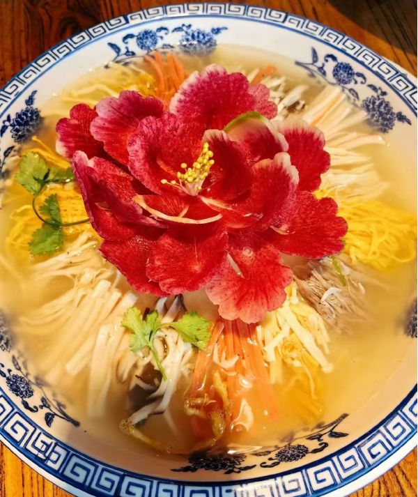 菜品特色:造型別致,盛開的“牡丹”浮于湯面,色彩絢麗;口感豐富,蘿卜絲軟嫩爽滑,有“燕窩”的質(zhì)感,各種配菜味道醇厚鮮美,湯汁酸辣開胃,兼具觀賞性與美味度,體現(xiàn)了洛陽飲食文化的深厚底蘊(yùn)。