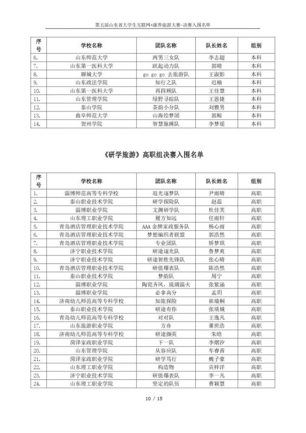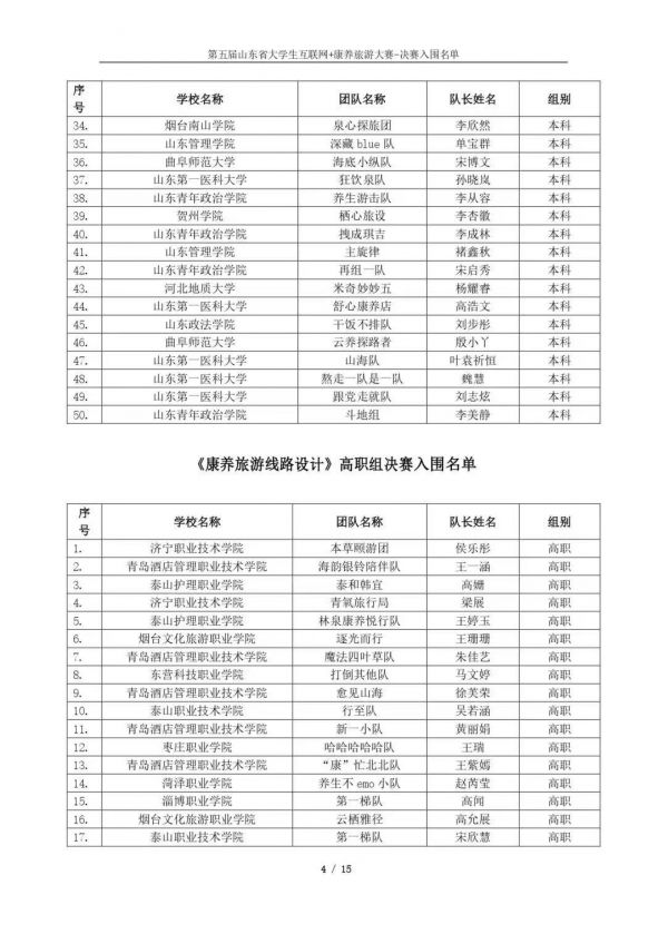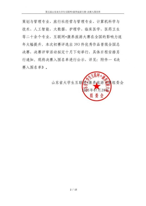 以下鏈接為第五屆山東省大學(xué)生互聯(lián)網(wǎng)+康養(yǎng)旅游大賽決賽入圍名單公示通知原文件:https://mp.weixin.qq.com/s/bd61lqBY3XZJo0ujX1mO_g?scene=1&click_id=2
