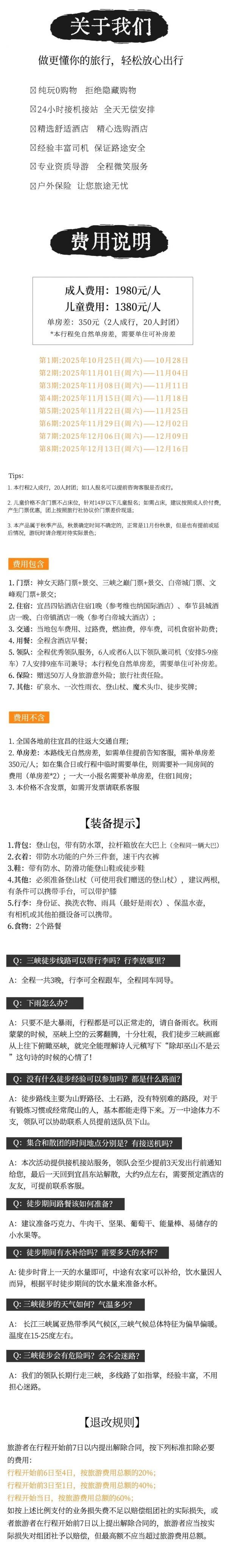A:只要不是大暴雨,行程都是可以正常走的,請(qǐng)自備雨衣。秋雨蒙蒙的時(shí)候,巫峽上空的云霧翻騰,十分壯觀,我們徒步三峽畫廊從上往下俯瞰巫峽,就完全能理解詩(shī)人元稹寫下“除卻巫山不是云”這句詩(shī)的時(shí)候的心情了!
