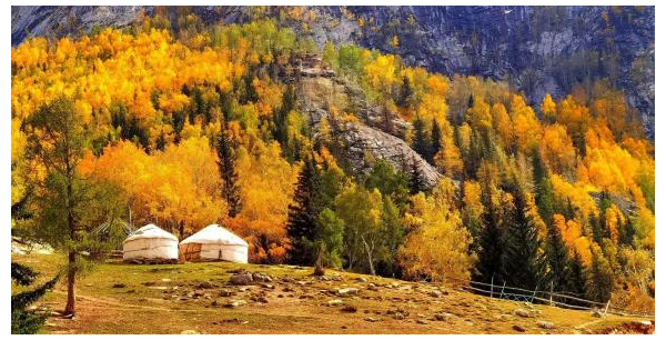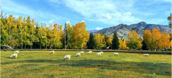 隨后的時(shí)光造訪了塔拉特民俗村。這座藏在阿爾泰山間的哈薩克族村落正被豐收的喜悅包裹,居民的院子里晾曬有金黃的玉米,屋檐下掛著一串串紅辣椒,牛羊在村外的草地上悠閑啃食,遠(yuǎn)處傳來(lái)幾聲牧人的吆喝,充滿了生活氣息。走進(jìn)一戶村民家,主人熱情地端上醇厚香甜的奶茶與外酥里嫩的馕餅。陽(yáng)光透過(guò)氈房的格窗灑進(jìn)來(lái),在地上投下斑駁的光影。坐在鋪著絨毯的炕上聽?wèi)糁髦v述生活點(diǎn)滴,忽然覺得所謂歲月靜好,大抵就是這煙火尋常吧。