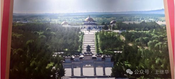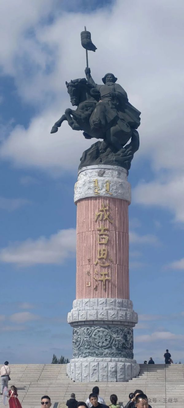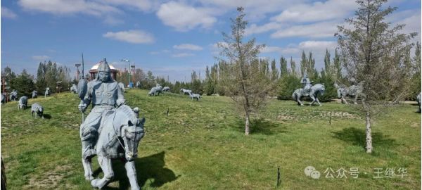 陵宮主殿的穹頂靜臥在碧草間,像一顆不慎落在綠毯上的珍珠。據(jù)說1954年國(guó)家就撥款興建了這座陵寢,走進(jìn)大門,12.5米高的成吉思汗騎馬雕像立在中央,像從天而降無比威武,他的目光越過遠(yuǎn)方,仿佛仍在凝視親手開拓的疆域。