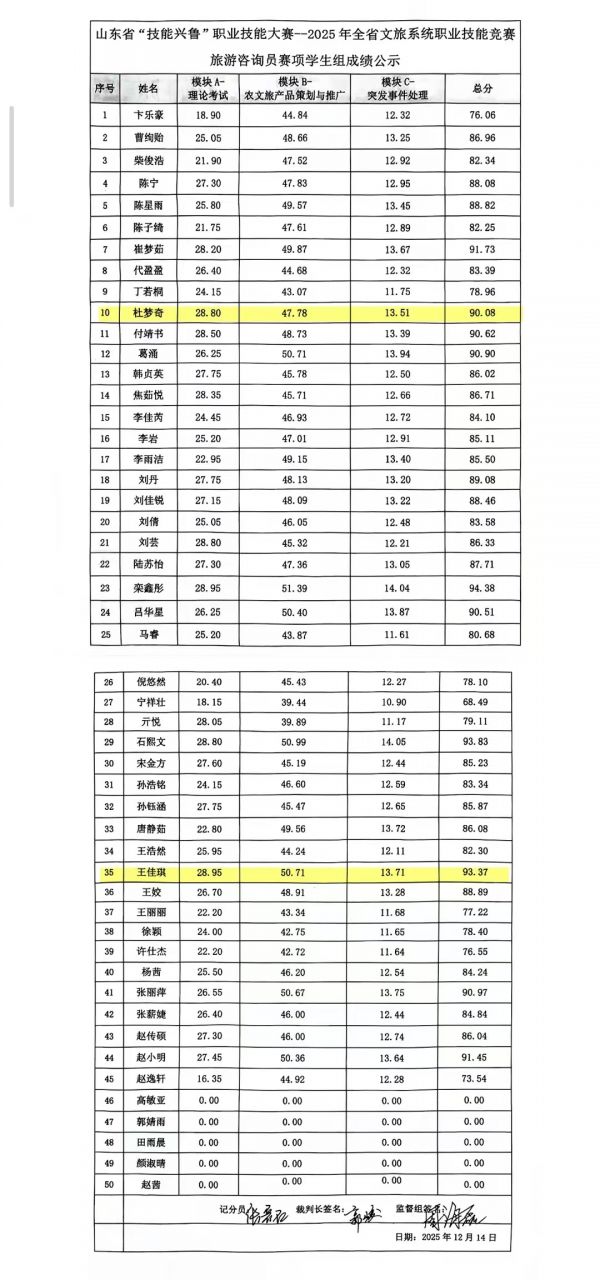 12月14日,2025年山東省“技能興魯”職業(yè)技能大賽全省文旅系統(tǒng)旅行社咨詢員賽項圓滿落幕。本次賽事聚焦文旅行業(yè)人才核心能力,吸引全省各地200余支參賽隊伍同臺競技,聊城職業(yè)技術(shù)學(xué)院文旅學(xué)院學(xué)生表現(xiàn)亮眼,憑借扎實的專業(yè)功底、出色的創(chuàng)新思維與高效的實戰(zhàn)能力脫穎而出,最終斬獲一等獎1項、二等獎1項,充分展現(xiàn)了我校文旅專業(yè)人才培養(yǎng)的過硬成效。