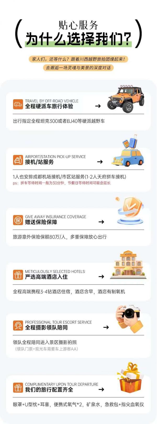 (3)本線路沒有“代購業(yè)務”,請不要在團隊中或者完團后,請求駕駛員代購任何產(chǎn)品,如有需要請自行篩選、購買。