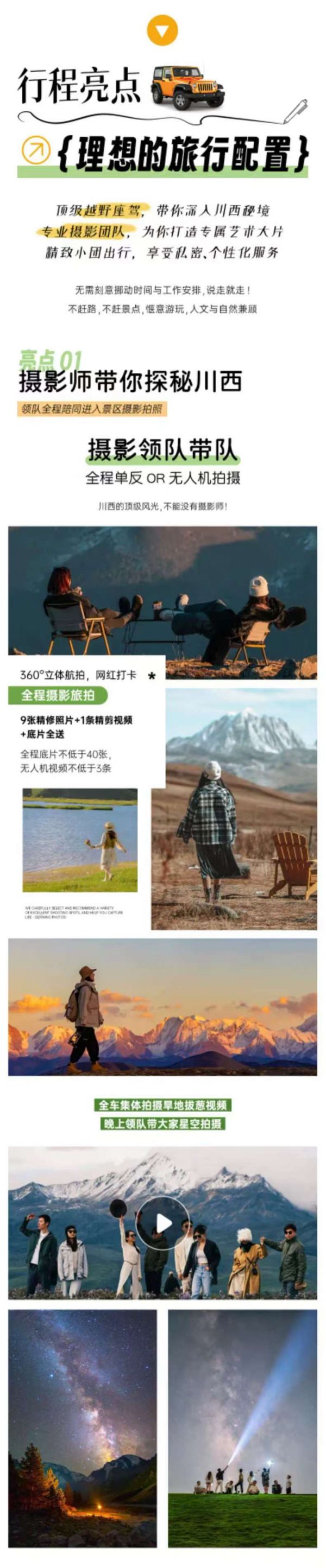 無人機+單反旅拍(底片全送+9張精修照片+1條精剪視頻),底片全程不低于40張,無人機視頻不低于3條(全車人拍攝旱地拔蔥視頻,晚上領隊帶大家星空拍攝);贈送藏服旅拍(6張底片+3張精修),全場衣服通選(除了三款羊皮襖)+精妝+精造;隨車便攜式氧氣瓶每人2瓶、旅行三寶1套/人、撒隆達1份;隨車配備礦泉水、急救包、指尖血氧儀;贈送特色土火鍋+篝火晚會+藏族歌舞表演晚會;可免費提供露營桌椅板凳爐具,可以野餐(食材車上游客一起AA),需提前預約;體驗藏區(qū)文化特色-畫唐卡;