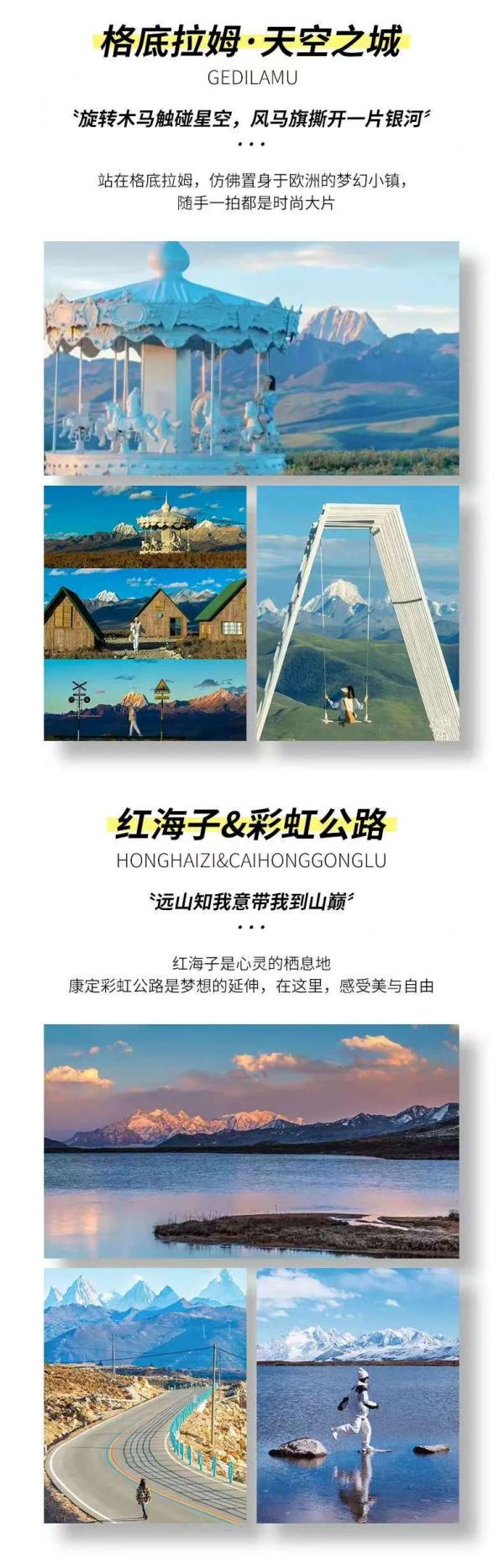 從新都橋出發(fā),沿著318國道前行,抵達天路十八彎,這里道路蜿蜒曲折,宛如一條巨龍盤旋山間,可在觀景臺俯瞰這一壯麗的天險景觀,感受川藏線的險峻與壯美。隨后繼續(xù)前行,翻越卡拉子山,欣賞沿途的高山草甸風光,還可在此撒隆達祈福,體驗獨特的藏族習俗。若選擇海子山,能看到古冰帽遺址,眾多高山湖泊如寶石般散落其間,湖光山色,美不勝收。最后,途經(jīng)稻城,欣賞萬畝青楊樹、赤土河谷迷人風光,抵達香格里拉鎮(zhèn),為這一天的行程畫上句號。