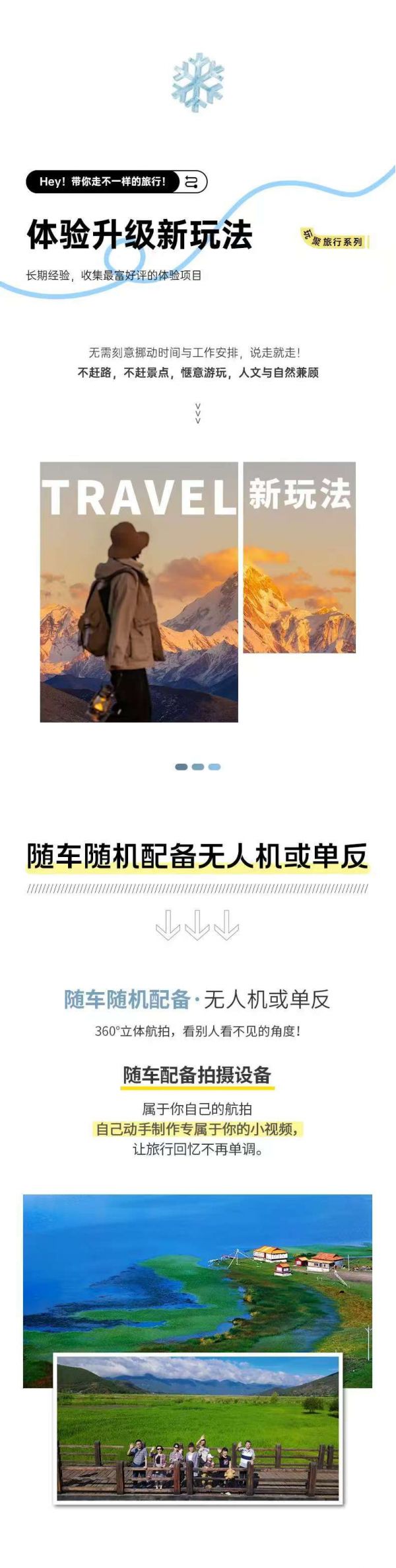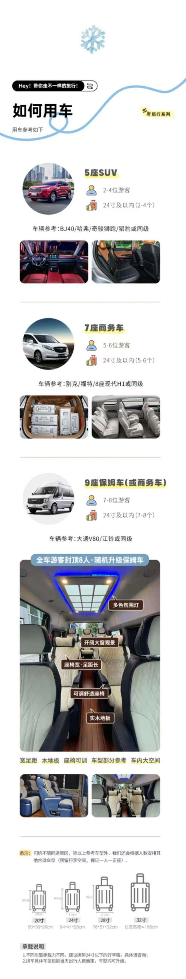 用車:2-8人VIP小團(tuán)為保證成團(tuán)及質(zhì)量,根據(jù)人數(shù)派不同座位數(shù)用車,保證每人一正座;包含司機(jī)一名、油費(fèi)、:過路費(fèi)、停車費(fèi),包含從出發(fā)地到景點(diǎn)及酒店費(fèi)用,不包含晚間自由活動(dòng)交通;2-4位游客:乘坐5座SUV;5-6位游客:乘坐7座商務(wù)車;7-8位游客:乘坐9座商務(wù)車(或隨機(jī)升級(jí)9座保姆車)備注:車型承載力有限,攜帶行李為24寸或以下行李箱。*隨車隨機(jī)配備無人機(jī)或單反(不指定);(節(jié)假日不保證團(tuán)團(tuán)配備)。