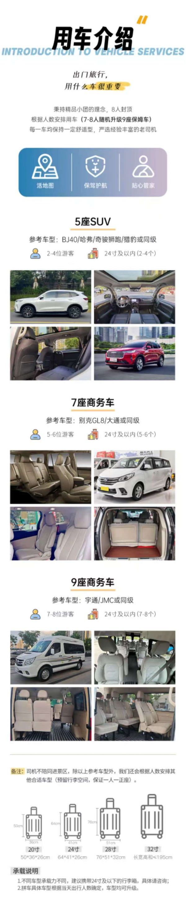 為保證成團(tuán)及質(zhì)量,根據(jù)人數(shù)派不同座位數(shù)用車,保證每人一正座;若遇資源緊張,會(huì)安排其他車型:包括但不限于5-7/9座或12-19座等正規(guī)旅游用車,車型均不接受指定,敬請(qǐng)諒解!