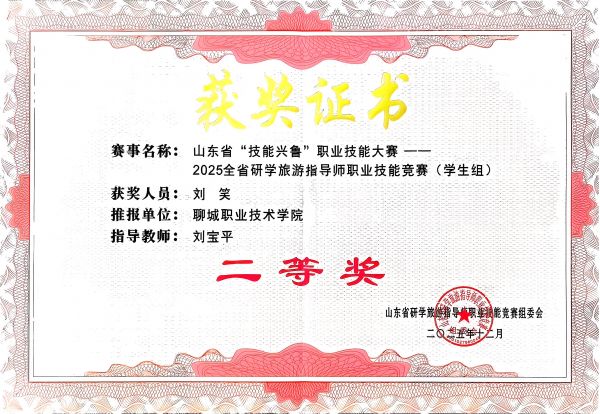 近日,2025年山東省“技能興魯”全省文旅系統(tǒng)職業(yè)技能競(jìng)賽研學(xué)旅游指導(dǎo)師賽項(xiàng)圓滿落幕。聊城職業(yè)技術(shù)學(xué)院參賽團(tuán)隊(duì)?wèi){借扎實(shí)的專業(yè)功底、出色的實(shí)踐能力和默契的團(tuán)隊(duì)協(xié)作,在全省眾多強(qiáng)手中脫穎而出,一舉斬獲二等獎(jiǎng)、優(yōu)秀組織獎(jiǎng)等三項(xiàng)榮譽(yù),充分彰顯了學(xué)校在文旅人才培養(yǎng)領(lǐng)域的深厚積淀與扎實(shí)成效。
