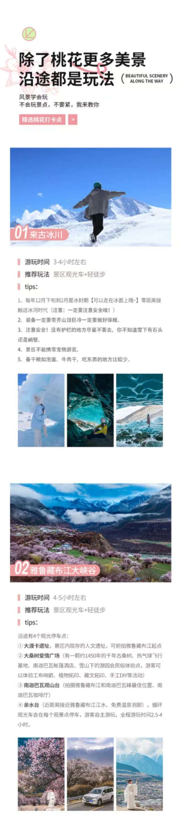 早餐后前往林芝桃花主會(huì)場(chǎng)【嘎拉桃花村】,被譽(yù)為“林芝桃花第一村”,是巴宜區(qū)乃至整個(gè)林芝地區(qū)的最佳賞花地,一排排盛開(kāi)的桃花在綠色麥田梯田的襯托下,整個(gè)山坡如同藏族婦女的圍裙耀眼奪目,素有“西藏江南”的美譽(yù)。這里的千年桃樹(shù)不是人為卻巧奪天工,為您呈現(xiàn)只屬于西藏的美。之后驅(qū)車(chē)翻越【色季拉山】埡口,抵達(dá)【魯朗小鎮(zhèn)】,魯朗小鎮(zhèn)有被稱(chēng)為“叫人不想家的地方”,推薦可以在此品嘗當(dāng)?shù)靥厣汀斃适侂u,午餐后,經(jīng)過(guò)318國(guó)道上著名的通麥天險(xiǎn),不過(guò)現(xiàn)在的【通麥大橋】已經(jīng)貫通,天塹變通途,。傍晚抵達(dá)【波密桃花溝】,十里桃花溝,可謂穿越進(jìn)入了桃源秘境。晚上在波密縣城入住。