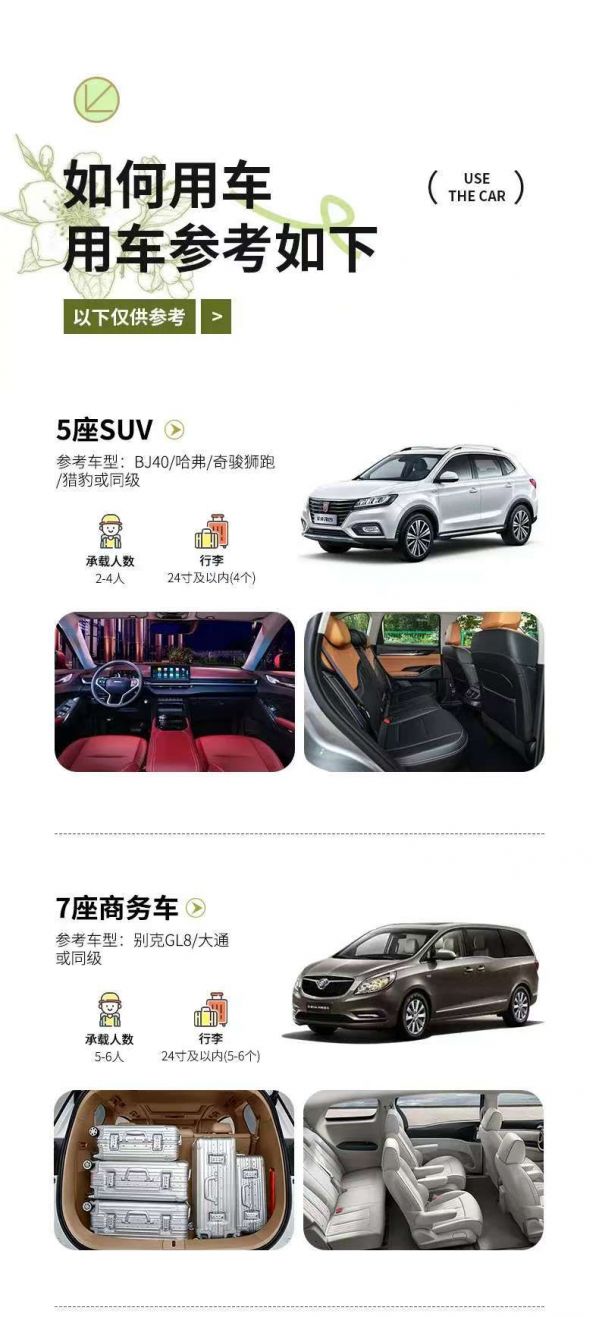 為保證成團(tuán)及質(zhì)量,根據(jù)人數(shù)派不同座位數(shù)用車,保證每人一正座;