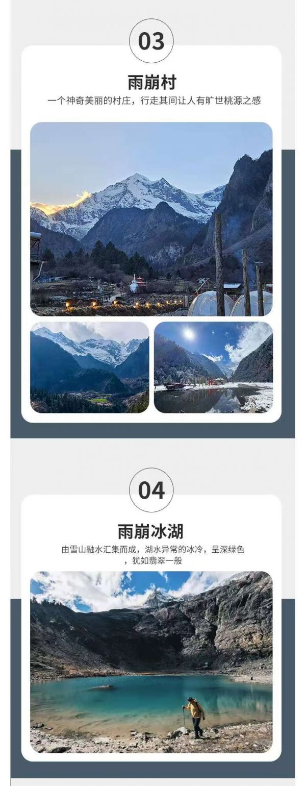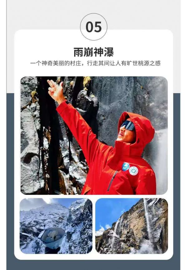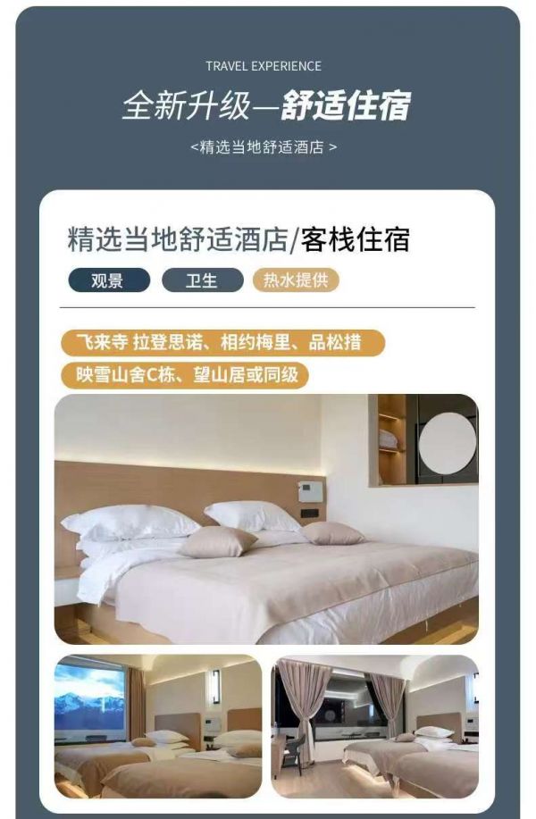 今天全程大約14公里。用時6-8小時。沿著尼農大峽谷一路徒步,兩邊是懸崖峭壁,這是古人從懸崖上鑿出來的一條通往雨萌秘境的陽光大道。徒步大約3.5小時到達補給點在這里稍作休息,后沿著公路前往雨崩,沿途美景如畫,令人目不暇接。到達雨崩村客棧后辦理入住自由活動。