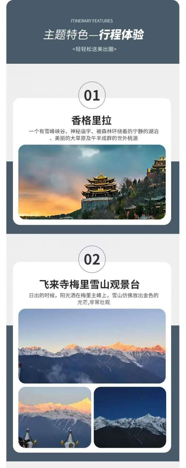 至彝族村寨觀景臺,俯瞰山巒與村落,感受民族風情。藍天白云下,彝族服飾與稻田相映成畫。繼而抵達香格里拉,如臨"人間天堂",神秘浪漫。草原廣闊,天空湛藍,牛羊成群,宛如夢幻世界。接著,金沙江月亮灣現身,江水似綢帶,蜿蜒群山間。"明月"天成,令人驚嘆。傍晚,夕陽余暉灑江面,波光粼粼美不勝收。翻越白馬雪山埡口,是身心考驗。但站在埡口俯瞰雪山壯景,疲憊盡消。潔白雪山,茂密森林,盡顯大自然雄偉神奇。