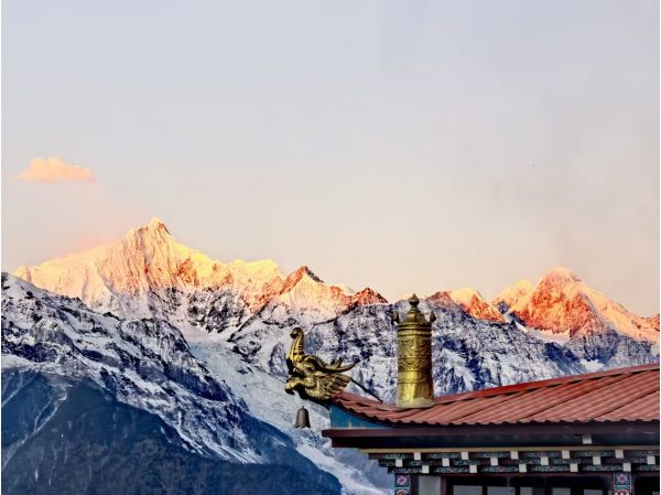 清晨,在飛來寺觀景臺欣賞美麗的日照金山奇景。之后,乘車一路前行,抵達尼農,開始徒步向雨崩村前進。