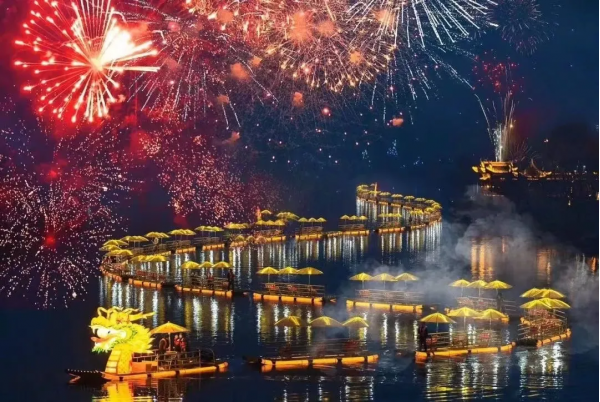 “金龍昂首喚春歸,萬象更新耀東方”,幾十艘竹連接,首尾相連組成“金色巨龍”游弋而過,抬頭煙花璀璨,上演中式浪漫。
