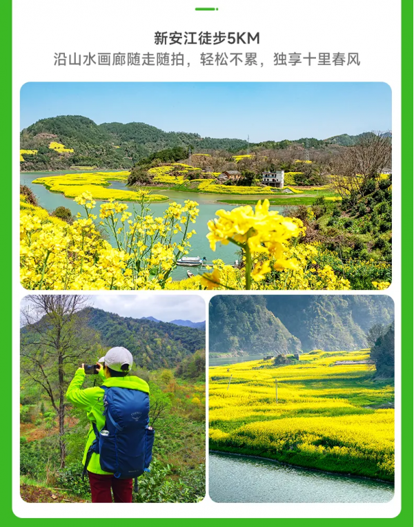 隨后領(lǐng)隊將帶領(lǐng)大家從【石潭】徒步至【新安江】(全程約5Km,難度較低),新安江山水畫廊沿江游步道,清江綠水清幽幽,兩岸青山排垯,金黃的油菜花撲滿岸堤,古老粉墻黛瓦徽派村落散步其中。感受“人行明鏡中,鳥度屏風里”的絕妙意境!
