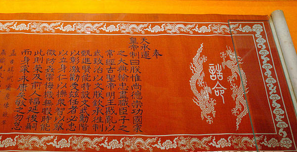 博物館館長劉新華先生介紹,這處“圣旨”博物館為二層仿古建筑,展出面積1000多平方米,館藏明代、清代的詔書、國書、誥封、敕封(通稱為圣旨) 達(dá)132道之多,開館展出的“圣旨”55道,以及“偽滿洲國圣旨”和日本、越南、韓國等國家的“圣旨”,并配以明清時(shí)期的科舉試題、殿試卷、官場文書、字畫匾牌及用墨魚汁做墨汁密寫在衣衫內(nèi)的“夾帶小抄”等科舉文物2000多件,反映了當(dāng)時(shí)的政治、經(jīng)濟(jì)、軍事、外交及中國宮廷文化等多種形態(tài)。
