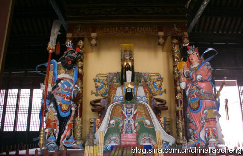 進(jìn)入大殿,便可以看到三尊神像。原有的神像在解放前毀于戰(zhàn)火,現(xiàn)在的神像是1990年還原復(fù)制而成的泥塑像。中間是頭戴十二硫冕,手捧鎮(zhèn)圭,身穿龍袍的關(guān)圣帝君,兩側(cè)分別為周倉(cāng)和關(guān)平。關(guān)羽生前以忠義聞名,被封為漢壽亭侯漢前將軍。死后被追封為“壯繆”侯。后來(lái)的各朝各代的皇帝希望人們學(xué)習(xí)他的忠義為自己的封建統(tǒng)治王權(quán)服務(wù),所以對(duì)關(guān)公的封號(hào)也是非常多的。有對(duì)聯(lián)寫得好“漢封侯,宋封王,明封大帝;儒稱圣,釋稱佛,道稱天尊”。從中我們不難了解,各代王朝、儒、釋、道三界對(duì)關(guān)羽的推崇到了何等高度。所以,這兒關(guān)公神像的皇帝打扮是有歷史依據(jù)的,同時(shí)也表現(xiàn)了山陜商人對(duì)他的崇拜之情。另外,在我們印象中,關(guān)羽是臥蠶眉、丹鳳眼、面如重棗的美髯公,眼前的神像卻為什么是黃臉的呢?這里呢,有一個(gè)傳說(shuō)故事。