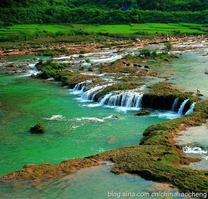 在祖國邊陲廣西大新縣,有一個奇特的旅游風(fēng)景區(qū),這就是遠近聞名的山水畫廊德天跨國大瀑布位于廣西大新縣碩龍鄉(xiāng)德天村。大自然竟然情有獨鐘,將山水神秀盡集于此地,形成了數(shù)百里的天然山水畫廊。在這百里山水畫廊中,德天跨國大瀑布是最最出彩的一幅山水圖畫。德天跨國大瀑布位于廣西大新縣碩龍鄉(xiāng)德天村。她橫跨中越兩國,是亞洲第一大、世界第二大的跨國瀑布德天瀑布,中方瀑布寬120米,與越南境內(nèi)的板約瀑布相連,全寬208米,僅次于著名的位于美國——加拿大邊境的尼亞加拉大瀑布。瀑布分三級飛瀉,垂直高度達60余米,氣勢磅礴,蔚為壯觀。其年均水流量是我國著名的黃果樹瀑布水流量的三倍。