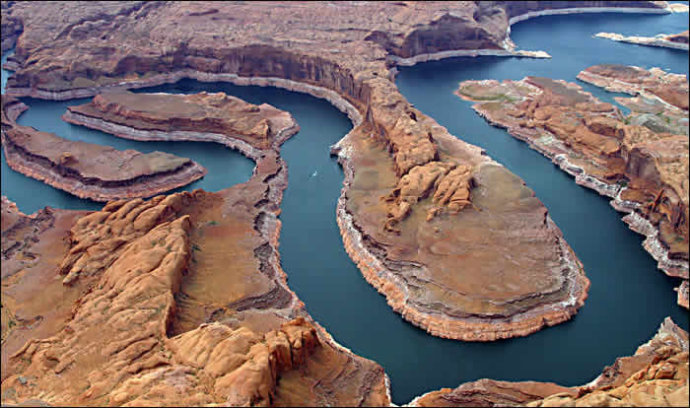 鮑威爾(POWELL)湖是為紀(jì)念那位第一個(gè)漂流此河并建議開(kāi)發(fā)水利的先驅(qū)而命名的。它的面積是米德湖的兩倍多,有各種紅色砂巖、石拱、峽谷和萬(wàn)面碧波,其風(fēng)景遠(yuǎn)勝米德湖,已成為美國(guó)西南部的主要國(guó)家度假區(qū)。