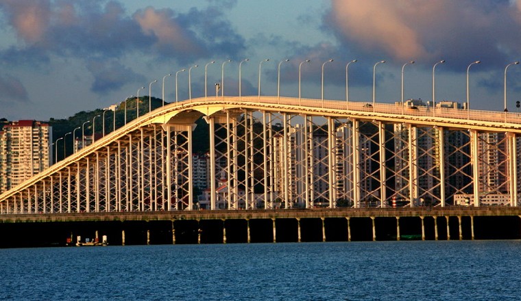 與兩岸建筑風(fēng)格和諧一體,顯得蔚為壯觀。澳氹大橋猶如一道飛跨鏡海上空的長虹,“鏡海長虹”也因此成為澳門八大景之一。