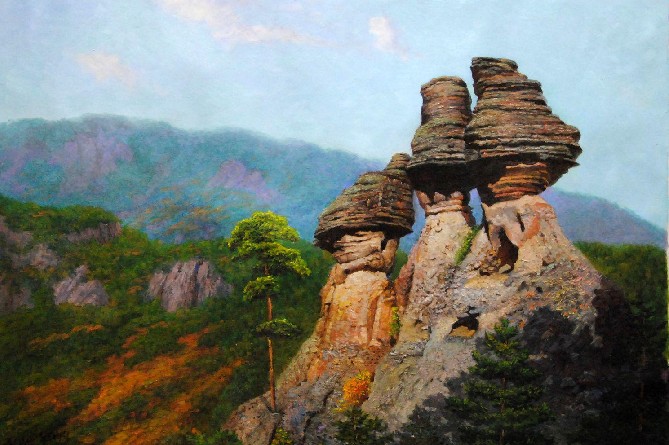 它是約100萬年前(即新生代第3期),從長白山( 朝鮮人稱:白頭山) 的火山脈噴出的熔巖冷卻后凝固而成的流紋巖、玄武巖等火成巖,經(jīng)受了長時期的風蝕雨削,形成一座座的山峰,形狀奇異。面積約為250平方公里。