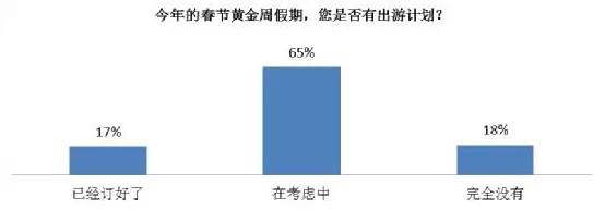 距2015年春節(jié)黃金周假期只有1個多月了,調(diào)查顯示,有出行意愿的網(wǎng)民達(dá)到八成。17%的網(wǎng)民已經(jīng)訂好了出游計劃,65%的網(wǎng)民仍在考慮中。18%的客戶表示沒有出游計劃。
